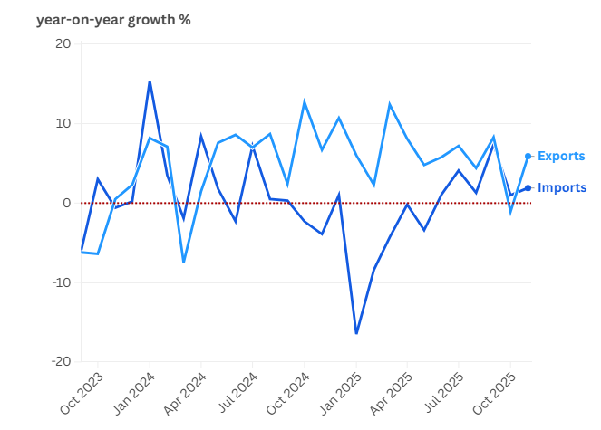 Theo số liệu hải quan Trung Quốc công bố hôm thứ Hai, tổng kim ngạch xuất khẩu tháng 11 của quốc gia này đạt 330,3 tỷ USD, tăng 5,9% so với năm ngoái, đảo chiều so với mức giảm 1,1% trong tháng 10. Nhập khẩu cũng tăng 1,9%, lên hơn 218,6 tỷ USD, cao hơn mức 1% của tháng trước, dù lĩnh vực bất động sản trì trệ vẫn gây sức ép lên nhu cầu tiêu dùng và đầu tư.