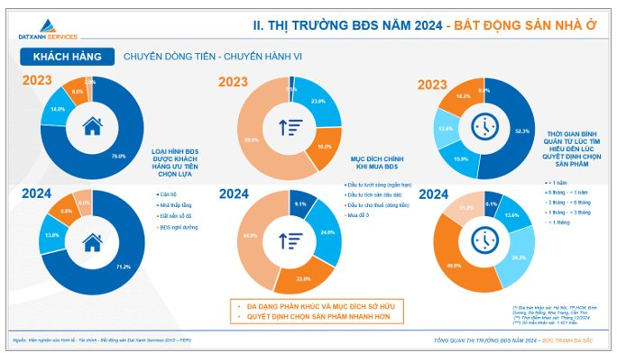 Báo cáo thị trường bất động sản của Viện nghiên cứu Datxanh Services chỉ ra, niềm tin thị trường bất động sản năm 2024 được củng cố và cải thiện rõ rệt, thể hiện qua số lượt tìm kiếm, tìm hiểu thông tin dự án liên tục tăng. Thời gian quyết định chọn sản phẩm giao dịch bất động sản giảm và đặc biệt là số giao dịch thành công tăng 2,5 lần so với năm 2023.