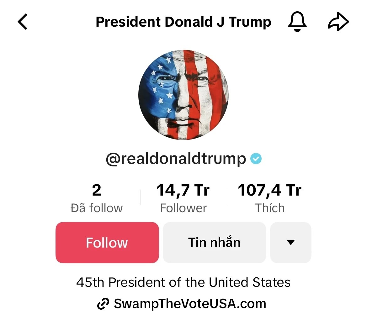 Tài khoản TikTok của ông Trump có 14,7 triệu người theo dõi.