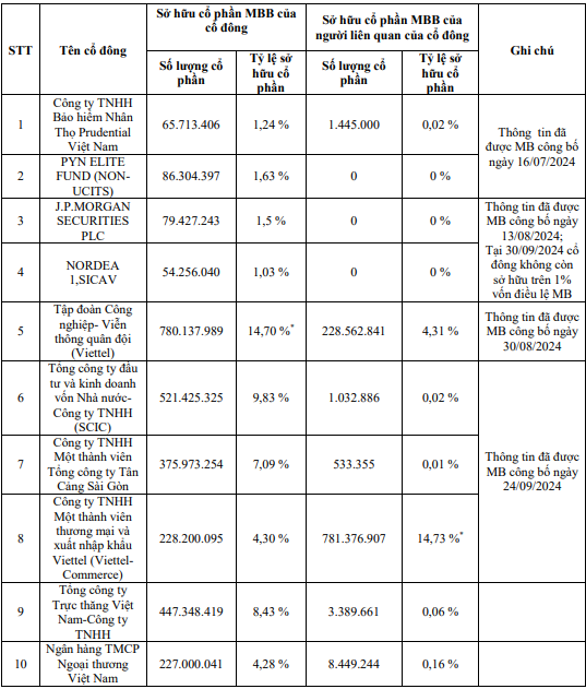 Xa hơn nữa, trong danh sách công bố vào tháng 10/2024, MBBank ghi nhận 10 cổ đông sở hữu trên 1% vốn. Trong đó, có 4 cổ đông lớn nắm tổng cộng hơn 40% vốn điều lệ, gồm Viettel, SCIC, Tổng công ty Trực thăng Việt Nam và Tổng công ty Tân cảng Sài Gòn.