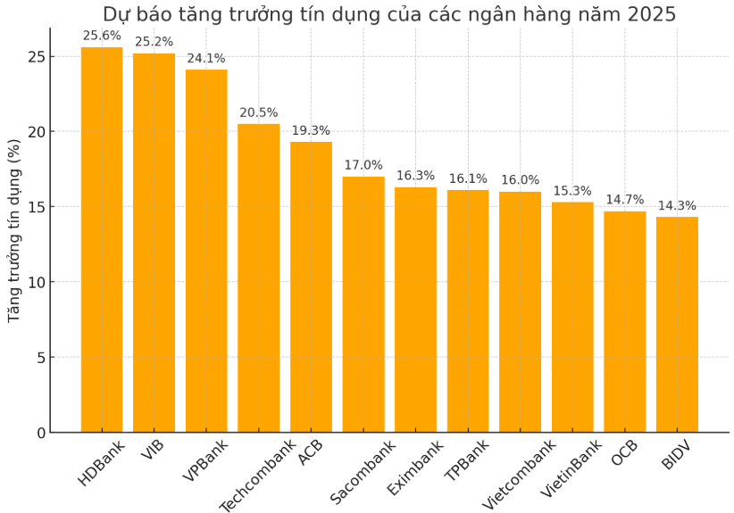 Theo báo cáo mới nhất của CTCP Chứng khoán MB (MBS), tăng trưởng tín dụng toàn ngành ngân hàng năm 2025 được dự báo đạt khoảng 17-18%, nhờ sự phục hồi mạnh mẽ của ngành sản xuất, tiêu dùng, đặc biệt là tín dụng bán lẻ.