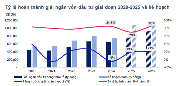 "Với vai trò là động lực quan trọng cho mục tiêu tăng trưởng GDP 10% trong năm 2026, chúng tôi kỳ vọng tỷ lệ giải ngân đầu tư công sẽ đạt khoảng 85%–90% kế hoạch, tương đương 920–970 nghìn tỷ đồng, tăng 21%–28% so với năm 2025", MBS cho hay.