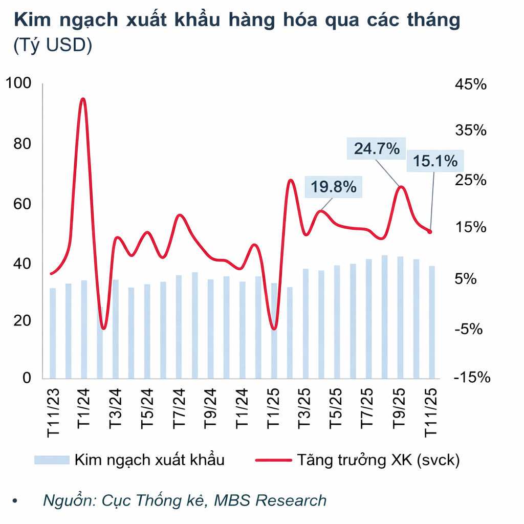 Với hoạt động xuất khẩu - một trụ cột khác của nền kinh tế, MBS dự báo tăng trưởng xuất khẩu sẽ đạt mức 15 - 16% trong năm sau. Nhận định của nhóm phân tích dựa trên 2 yếu tố chính.