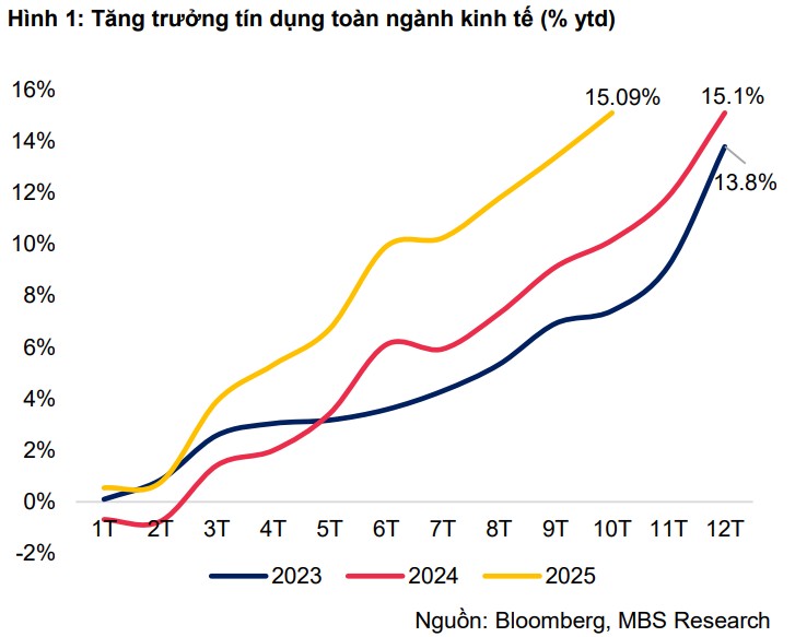 Theo báo cáo thị trường tiền tệ tháng 10 của CTCP Chứng khoán MB (MBS), tín dụng toàn hệ thống tính đến ngày 30/10 đã tăng khoảng 15% so với cuối năm 2024 và có thể chạm mốc 19-20% vào cuối năm, nhờ yếu tố chu kỳ và nhu cầu tín dụng dồn vào các tháng cuối.