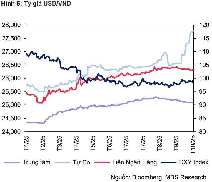 Về diễn biến tỷ giá, MBS ghi nhận sự phân hóa rõ rệt trong tháng 10. Tỷ giá liên ngân hàng và tỷ giá trung tâm tiếp tục giảm nhẹ sau khi đạt đỉnh, lần lượt xuống mức 26.307 VND/USD (giảm 0,5%) và 25.093 VND/USD (giảm 0,8%). So với đầu năm, hai mức tỷ giá này vẫn tăng lần lượt 3,3% và 3,1%.