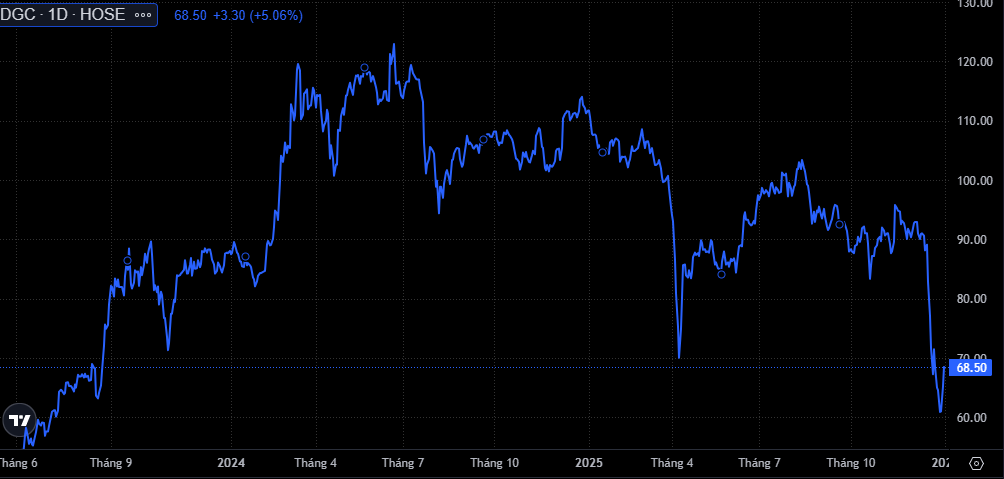 Trên thực tế, kể từ khi được đưa vào rổ VN30 vào giữa tháng 7 năm nay, cổ phiếu DGC liên tục thể hiện hiệu suất kém tích cực. Trong hơn 5 tháng gần đây, thị giá mã này đã giảm trên 30%, qua đó rơi xuống quanh vùng đáy thấp nhất trong hơn 2 năm qua.