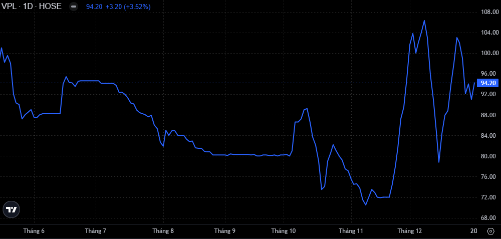 Kết năm 2025, VPL đóng cửa ở mức 94.200 đồng/cp, tương ứng mức tăng trưởng hơn 10% so với thời điểm mới niêm yết trở lại hồi tháng 5.