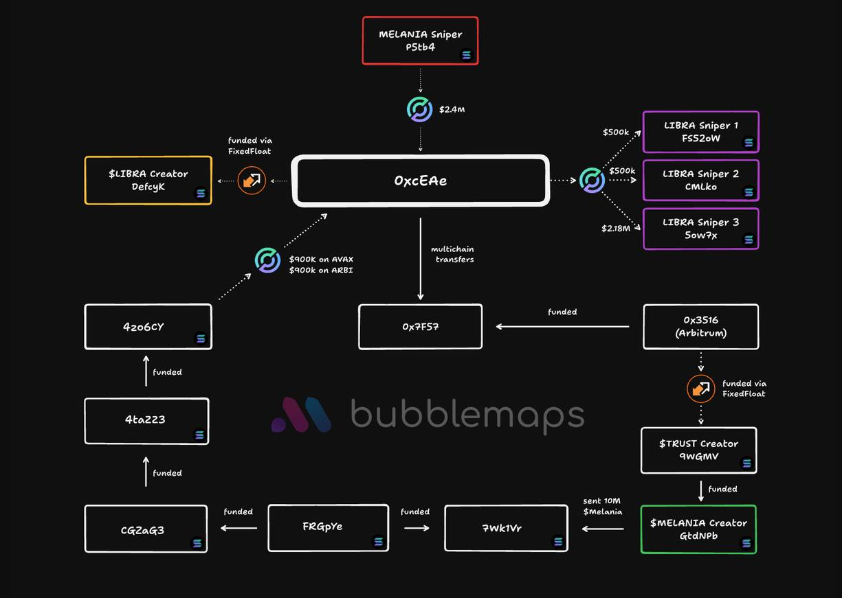 🔹 Không chỉ LIBRA và MELANIA, mà địa chỉ "0xcEA" này còn liên quan đến các đồng coin khác như TRUST, KACY, VIBES, HOOD