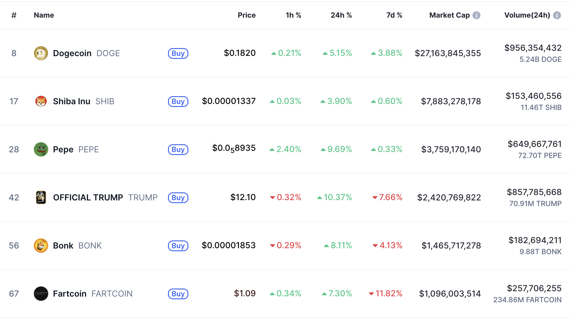 Bảng xếp hạng memecoin theo vốn hoá thị trường, tính đến ngày 8/5/2025 (Nguồn: CoinMarketCap)