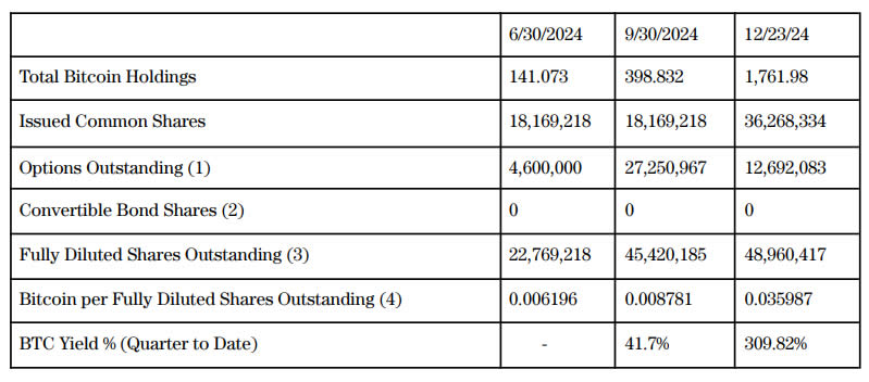 Công ty tuyên bố, họ đang sử dụng "BTC Yield" (chỉ số để thống kê hoạt động đầu tư BTC do MicroStrategy đưa ra) nhằm "đánh giá hiệu quả chiến lược gom mua Bitcoin, với mục đích mang lại lợi ích cho các đổ đông".