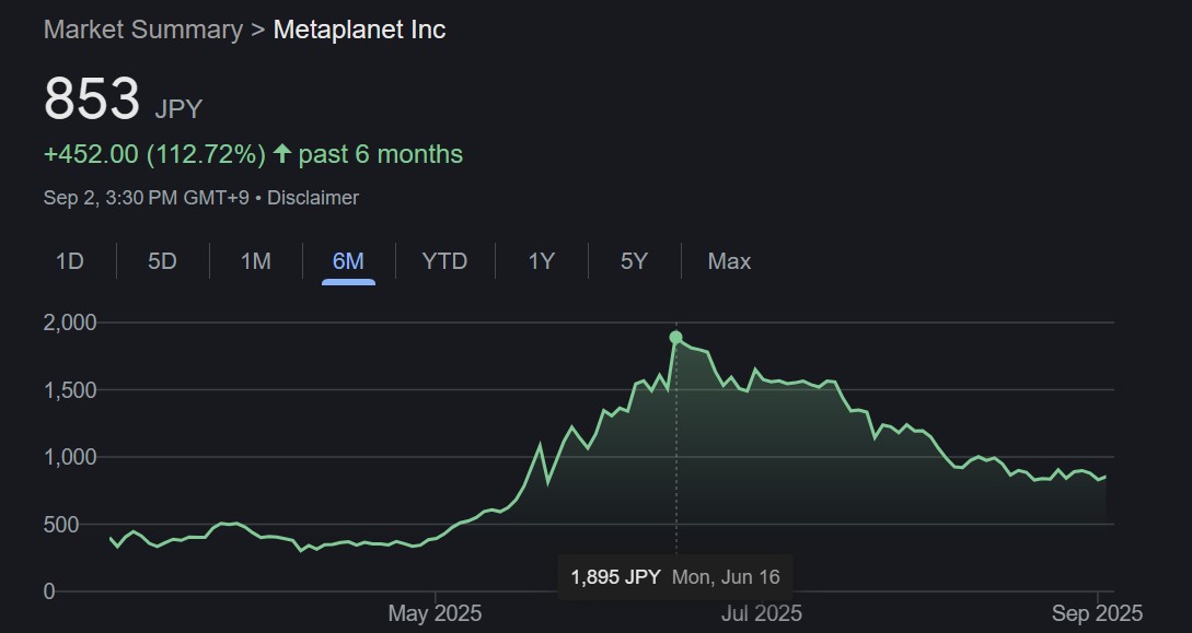 Giá cổ phiếu Metaplanet trong sáu tháng qua (Nguồn: Google Finance)