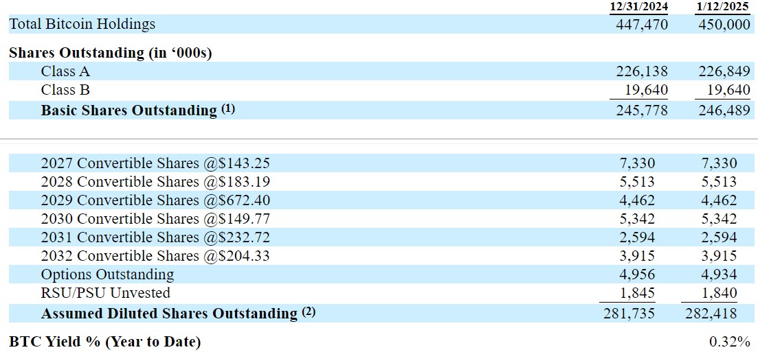 Theo hồ sơ nộp lên SEC, tính đến ngày 12/1/2024, kho vàng kỹ thuật số của MicroStrategy đã mở rộng lên 450.000 Bitcoin, với giá mua tổng cộng 28,2 tỷ USD, tương đương mức giá trung bình là 62.691 USD cho mỗi đồng BTC.