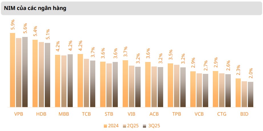Một số ngân hàng tư nhân ghi nhận tín hiệu tích cực: NIM của VPBank tăng 0,09 điểm %, còn Sacombank tăng 0,11 điểm % nhờ thu hồi khoản lãi từ dự án Khu công nghiệp Phong Phú. Ngược lại, nhóm ngân hàng quốc doanh tiếp tục chịu áp lực thu hẹp NIM do vai trò dẫn dắt mặt bằng lãi suất.