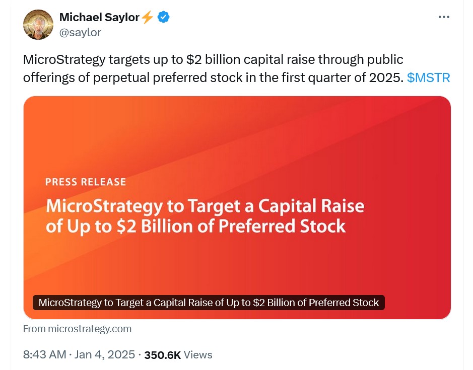 Lưu ý rằng, đợt chào bán trên tách biệt với "kế hoạch 21/21" mà MicroStrategy công bố trước đó, dự kiến triển khai ngay trong quý 1/2025. Cá voi Bitcoin cũng khẳng định quyết định cuối cùng sẽ phụ thuộc vào điều kiện thị trường. Họ hoàn toàn có thể hủy bỏ kế hoạch nếu thấy không khả thi.