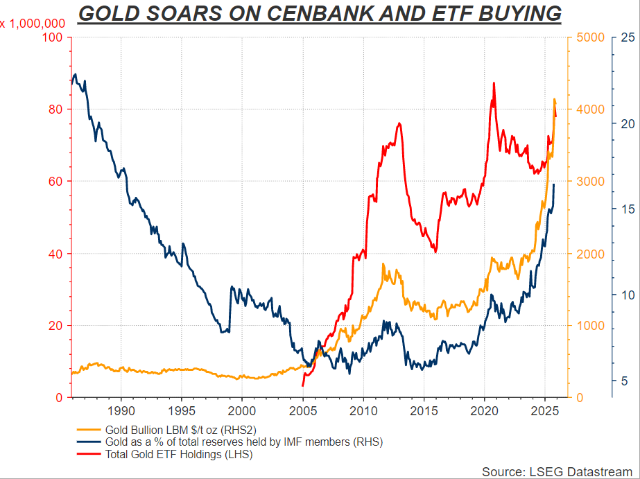 Vàng tăng vọt nhờ lực mua từ các NHTW và quỹ ETF (Nguồn: LSEG Datastream)