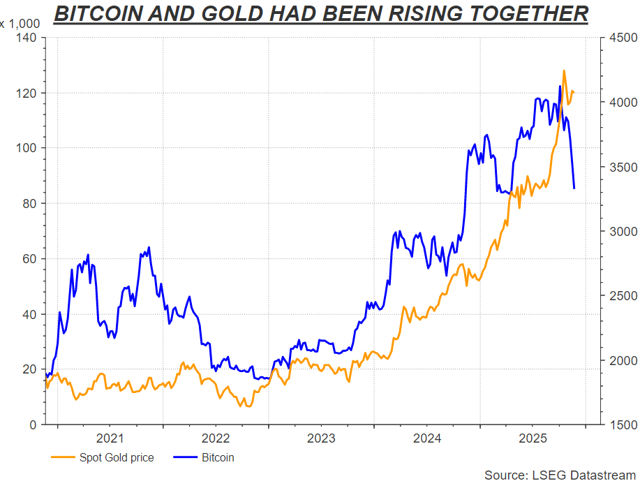 Tương quan giữa giá vàng và giá Bitcoin (Nguồn: LSEG Datastream)