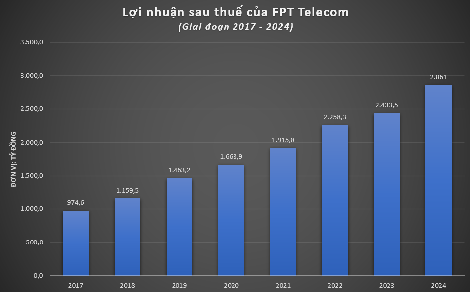 Năm 2024, FPT Telecom ghi nhận doanh thu thuần đạt 17.610,4 tỷ đồng, tăng 11,4% so với năm trước. Khấu trừ chi phí, doanh nghiệp này báo lãi sau thuế 2.861 tỷ đồng, tăng 17,5% so với năm 2023 - đánh dấu năm tăng trưởng lợi nhuận thứ 7 liên tiếp./.