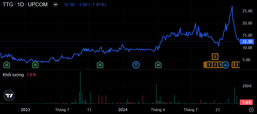 Trên thị trường chứng khoán, giai đoạn từ cuối tháng 9 đến cuối tháng 10, cổ phiếu TTG bất ngờ bật tăng tới 153% và thiết lập đỉnh lực sử ở mức 26.900 đồng tại phiên 20/11. Tuy nhiên, mã này sau đó liên tục ghi nhận các nhịp điều chỉnh mạnh.