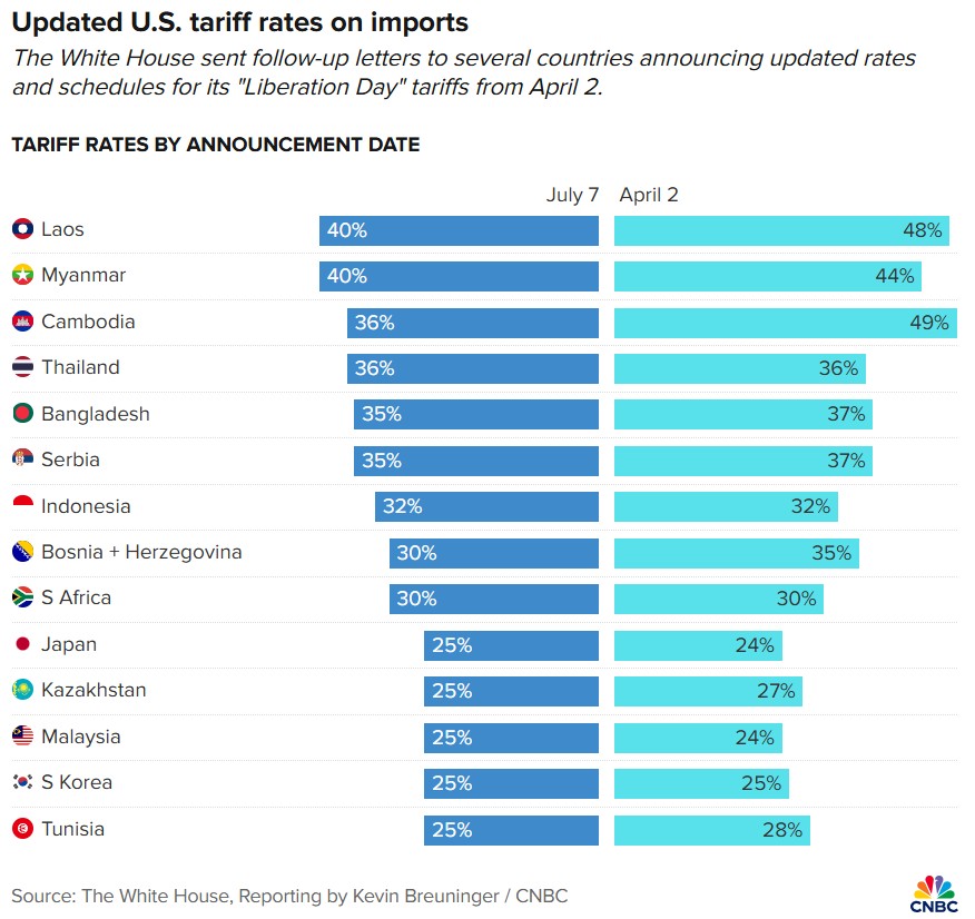 Bên cạnh Nhật Bản và Hàn Quốc, Mỹ còn công bố áp thuế nhập khẩu mới với 12 quốc gia khác, phần lớn có mức áp thuế thấp hơn hoặc bằng đợt đầu tháng 4.