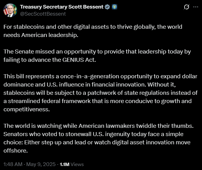 Bộ Trưởng Tài chính Scott Bessent lo sợ Mỹ sẽ chậm chân trong cuộc đua tiền số (Nguồn: X)