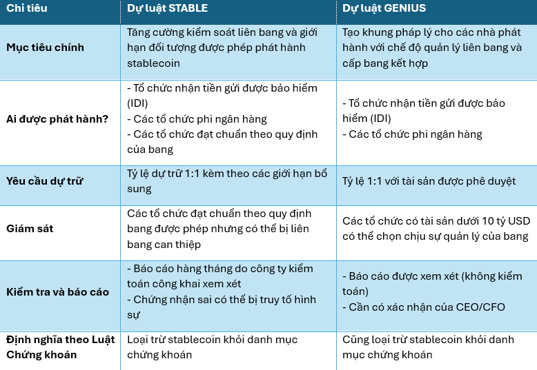 Sự khác biệt chính giữa Dự luật STABLE và GENIUS (Nguồn: DFF.VN tổng hợp)