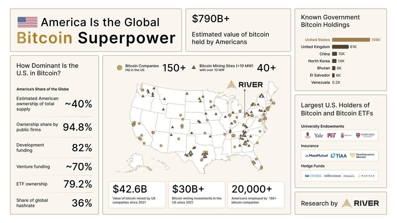 Thống kê từ River cho thấy, Mỹ không chỉ dẫn đầu về sở hữu Bitcoin mà còn chiếm ưu thế tuyệt đối trong gần như mọi khía cạnh của ngành công nghiệp này - từ khai thác, phát triển phần mềm, đầu tư mạo hiểm đến ETF.