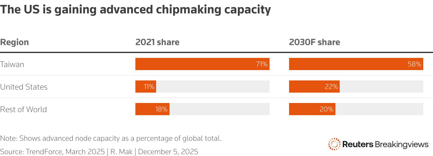 Dự báo năng lực sản xuất chip tiên tiến của Mỹ và Đài Loan đến năm 2030 (Nguồn: Reueters)