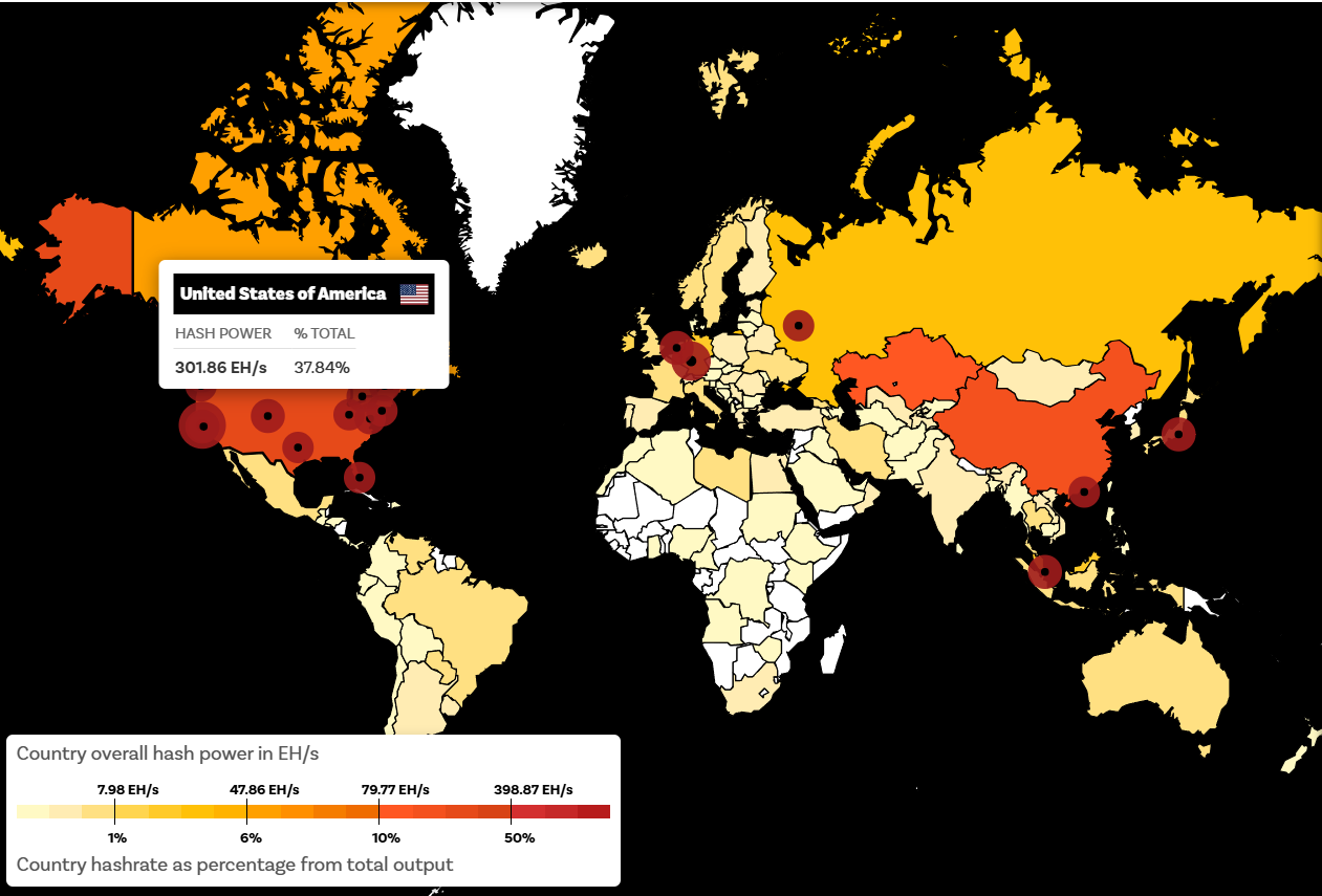 Mỹ chiếm gần 38% tổng hashrate toàn cầu (Nguồn: Bitcoin Mining Map)