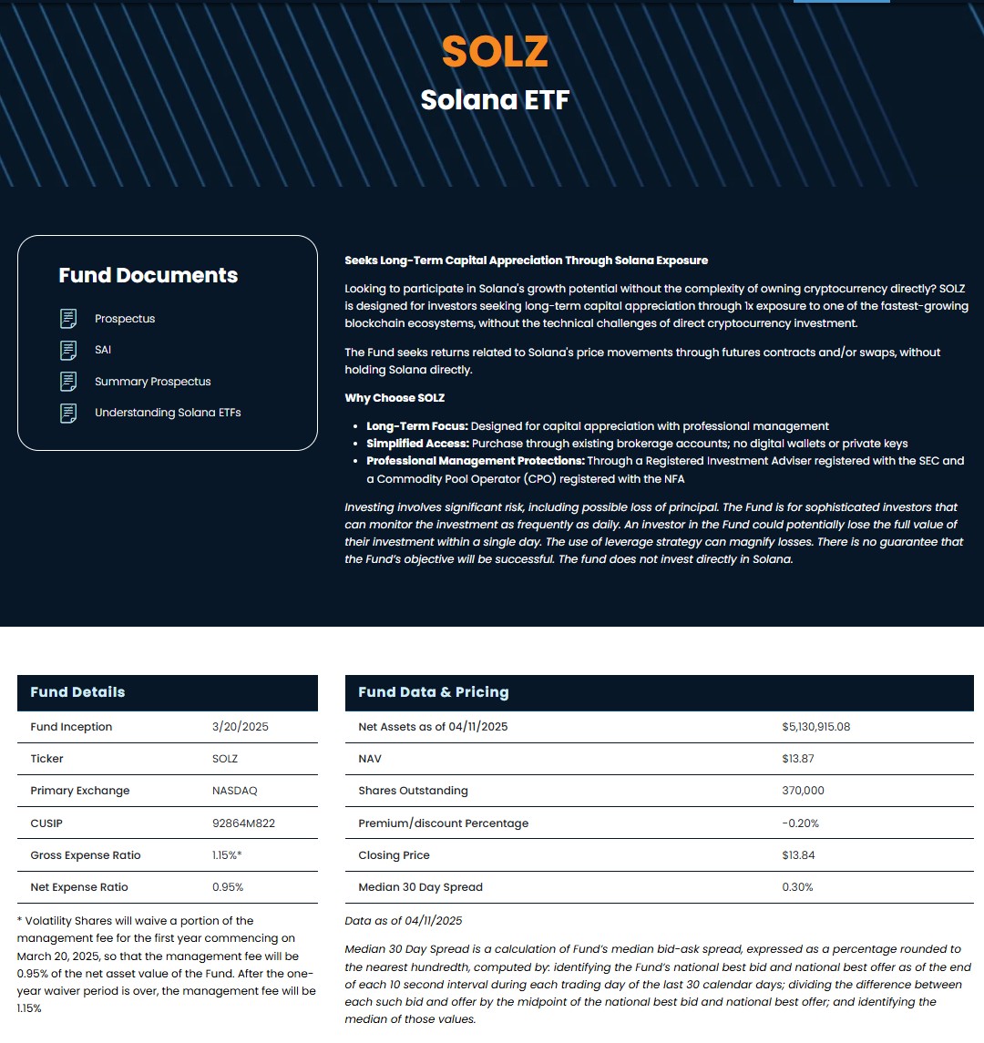 ETF Solana của Volatility Shares (mã SOLZ) chỉ thu hút được khoảng 5 triệu USD (Nguồn: Volatility Shares)