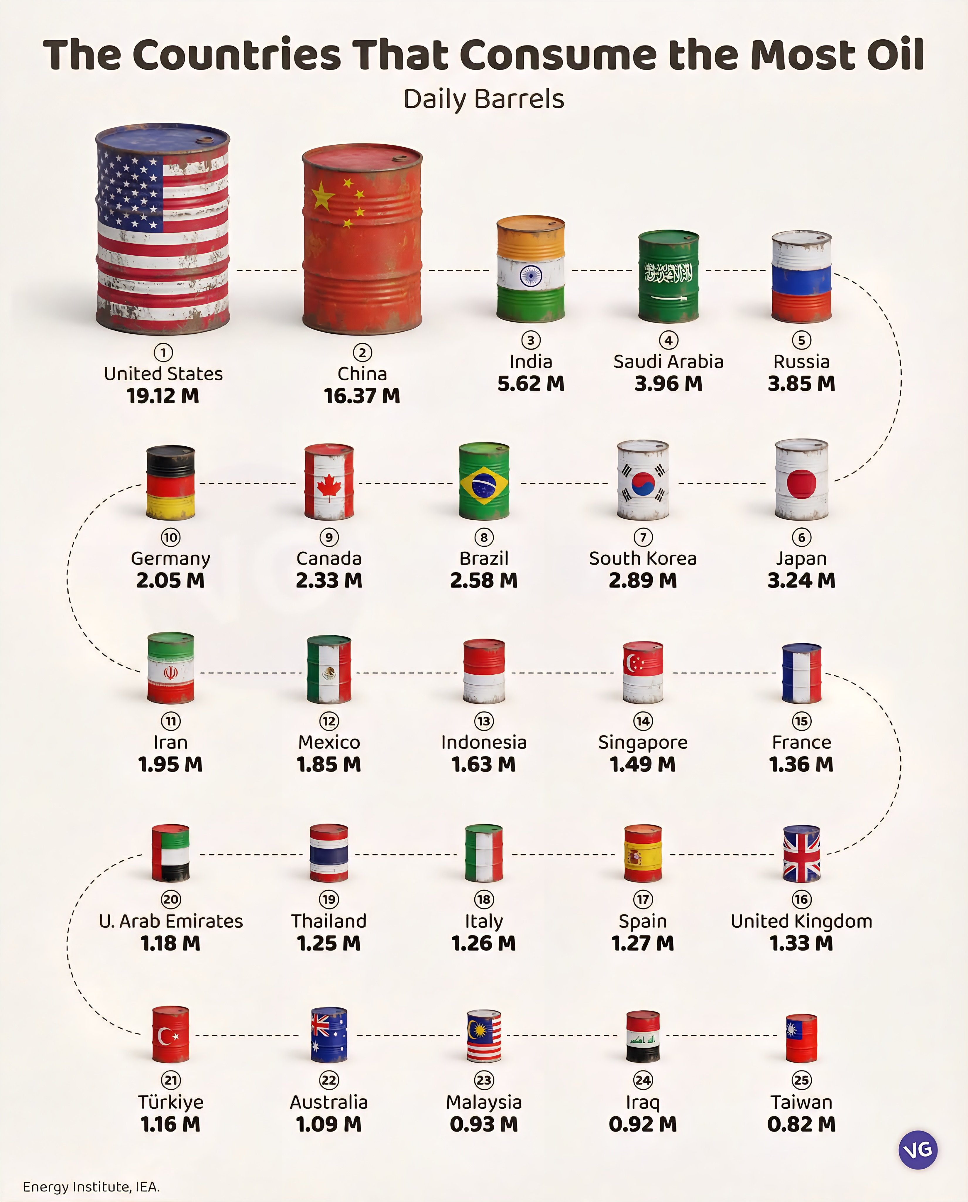 Tiêu thụ dầu mỏ toàn cầu vẫn tập trung chủ yếu ở một số nền kinh tế lớn, có nhu cầu năng lượng khổng lồ. Dưới đây là danh sách 25 quốc gia tiêu thụ dầu mỏ nhiều nhất (lượng tiêu thụ hàng ngày):
