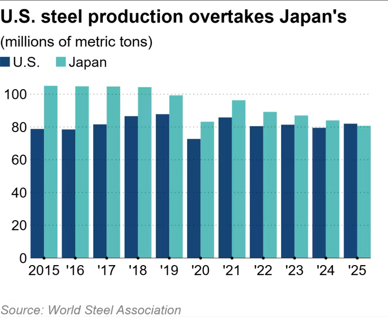 Đây cũng là lần đầu tiên kể từ năm 1999 Mỹ vượt qua Nhật Bản về sản lượng thép.