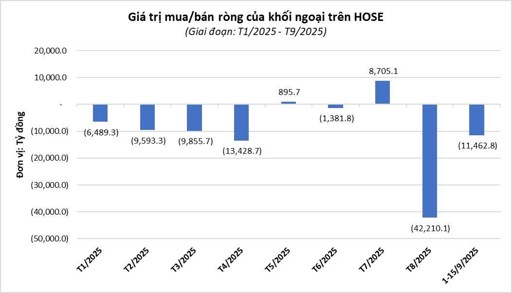 Dữ liệu gần đây phản ánh xu hướng bán ròng mạnh mẽ. Khối ngoại bán ròng tổng cộng gần 73.400 tỷ đồng từ đầu năm 2025 tính đến hết tháng 8. Phiên đầu tuần ngày 15/9 họ bán ròng khoảng 1.400 tỷ đồng trên toàn thị trường, riêng HoSE khoảng 1.321 tỷ đồng.