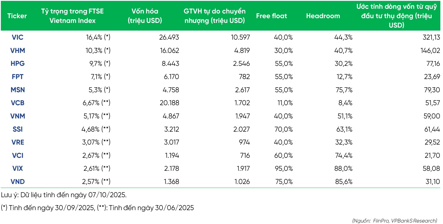 Dựa trên giả định toàn bộ cổ phiếu trong rổ chỉ số FTSE Vietnam Index sẽ được đưa vào bộ chỉ số các thị trường mới nổi của FTSE, VPBankS ước tính tổng giá trị dòng vốn chủ động và thụ động (ETF) có thể đạt khoảng 3 - 7 tỷ USD trong giai đoạn sau khi quyết định nâng hạng có hiệu lực.