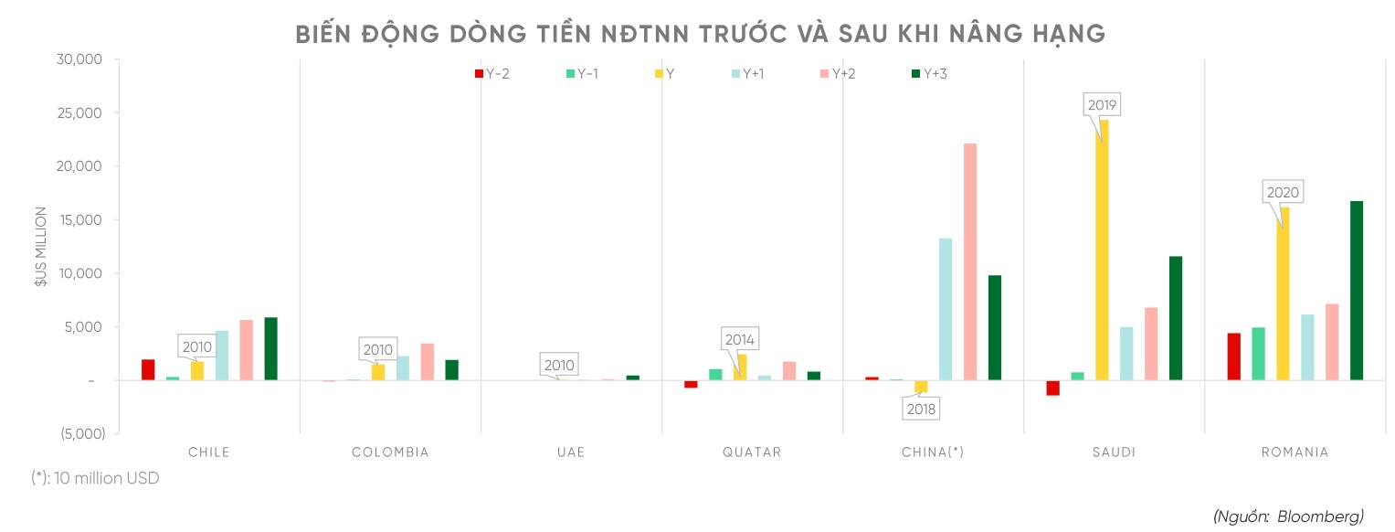 Dẫn số liệu từ Bloomberg, VPBankS cho biết hầu hết các thị trường từng được nâng hạng đều ghi nhận dòng vốn nước ngoài tăng mạnh sau khi chính thức được nâng hạng – bất kể theo tiêu chí đánh giá của FTSE hay MSCI. Trung bình, dòng vốn tăng gấp 5 - 7 lần so với bình quân giai đoạn trước.