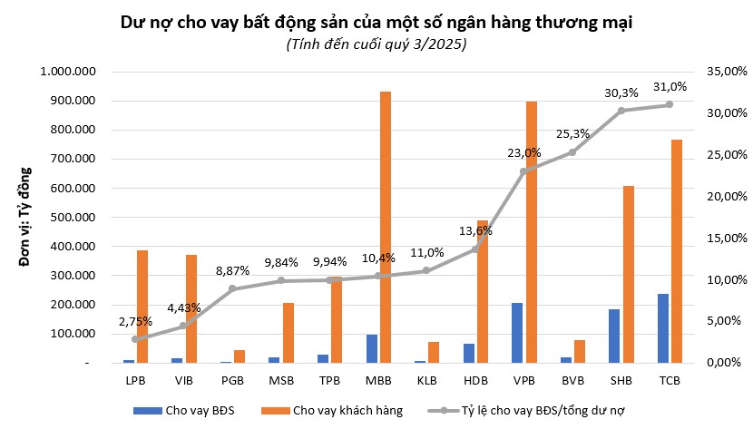 Theo số liệu công bố cập nhật gần nhất – quý 3/2025 của các ngân hàng thương mại cổ phần niêm yết, dư nợ cho vay bất động sản hiện chiếm tỷ trọng đáng kể. Trong số 12 ngân hàng công bố chi tiết theo ngành, tổng dư nợ cho vay bất động sản tính đến ngày 30/9/2025 đạt gần 900.000 tỷ đồng, chiếm hơn 17,6% tổng dư nợ cho vay khách hàng.