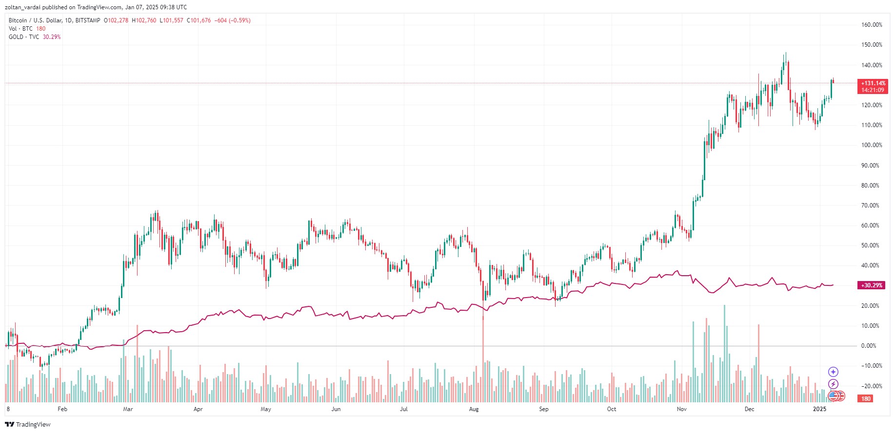 So sánh biến động của BTC và vàng trong 1 năm qua (Nguồn: TradingView)