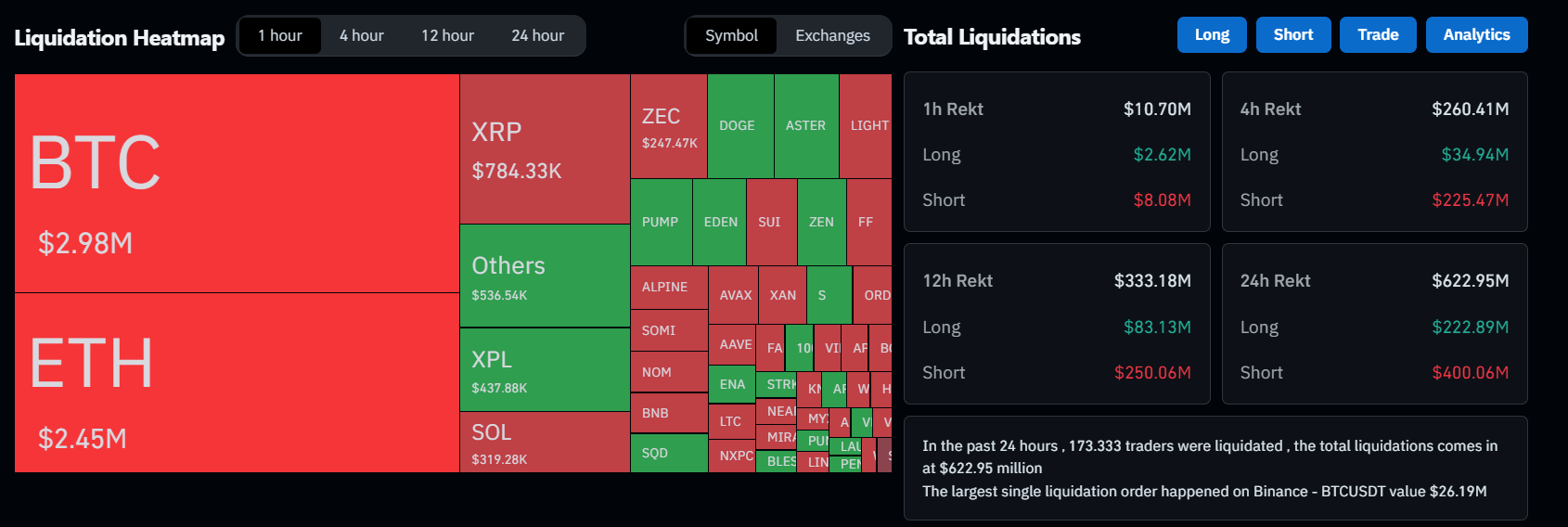 Hơn 205 triệu USD lệnh short bị quét sạch chỉ trong 1 giờ qua, chủ yếu đến từ BTC và ETH, đẩy giá lên cao hơn. Tổng giá trị thanh lý toàn toàn thị trường đã vượt 600 triệu USD, khiến hơn 172.000 traders "nhận mail".