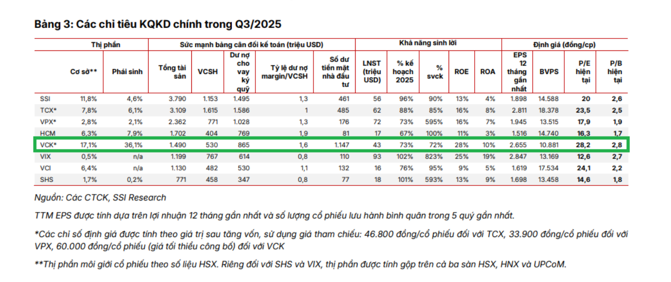 Từ góc nhìn kinh doanh, VPS báo lãi sau thuế quý III/2025 đạt 1.126 tỷ đồng, tăng 72% so với cùng kỳ, đưa lũy kế 9 tháng lên 2.564 tỷ, tăng 52% YoY. Dấu ấn tăng trưởng này phản ánh hiệu quả của chiến lược tập trung vào mảng cốt lõi - môi giới và cho vay margin (trên 22.000 tỷ đồng); việc không tham gia tự doanh cổ phiếu giúp VPS loại bỏ rủi ro khi thị trường biến động.