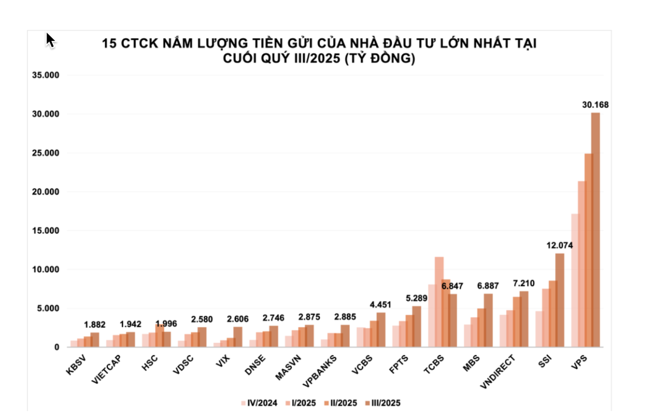 Cùng với mảng môi giới, nguồn lực tài chính mạnh giúp VPS tiếp tục mở rộng hoạt động margin. Tới cuối tháng 9/2025, công ty đang dẫn đầu ngành với 30.200 tỷ đồng tiền gửi của nhà đầu tư, gấp hơn hai lần công ty xếp sau là SSI đồng thời chiếm 27% toàn ngành (tổng hợp từ dữ liệu Wichart).
