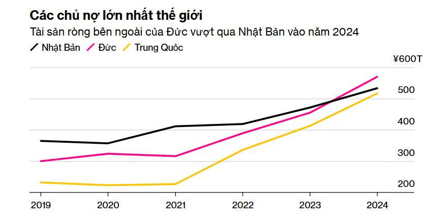 Theo số liệu từ Bộ Tài chính Nhật Bản, tính đến cuối năm 2024, tổng tài sản ròng ở nước ngoài của nước này đạt 533.050 tỷ yên, tương đương 3.700 tỷ USD, tăng 13% so với năm 2023. Tuy nhiên, con số này vẫn xếp sau Đức với 569.700 tỷ yên, còn Trung Quốc đứng thứ 3 với 516.300 tỷ yên.