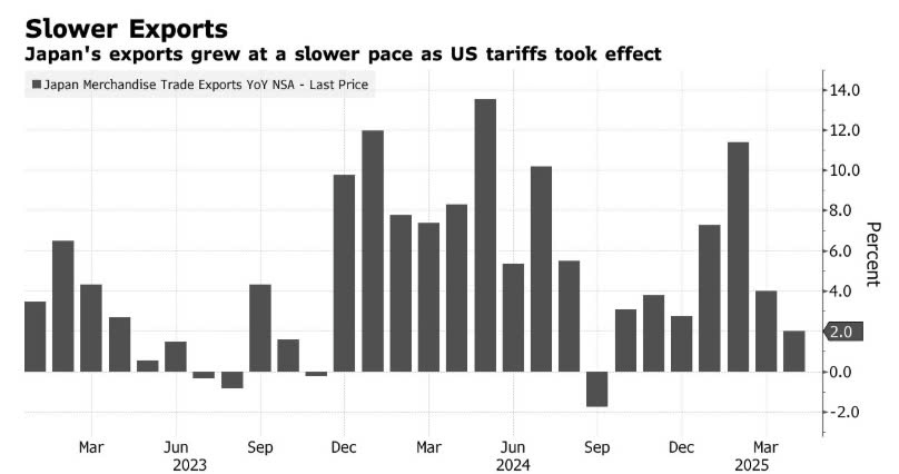 Tăng trưởng xuất khẩu tháng 4 của Nhật Bản chững lại khi Mỹ đẩy mạnh các biện pháp thuế quan. Điều này làm gia tăng lo ngại về triển vọng của nền kinh tế lớn thứ 2 châu Á – vốn đã suy giảm trước khi căng thẳng thương mại leo thang.