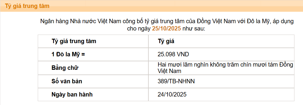 Sau động thái của NHNN, tỷ giá có dấu hiệu hạ nhiệt. Ngày 23/10, NHNN công bố tỷ giá trung tâm ở mức 25.098 VND/USD, giảm 3 đồng so với cuối tuần trước.