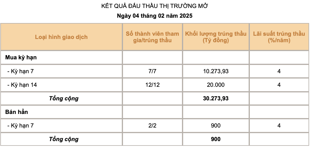 Tính đến ngày 4/2, tổng lượng tín phiếu đang lưu hành trên thị trường là 24.049 tỷ đồng và lượng OMO lưu hành là hơn 163.500 tỷ đồng.