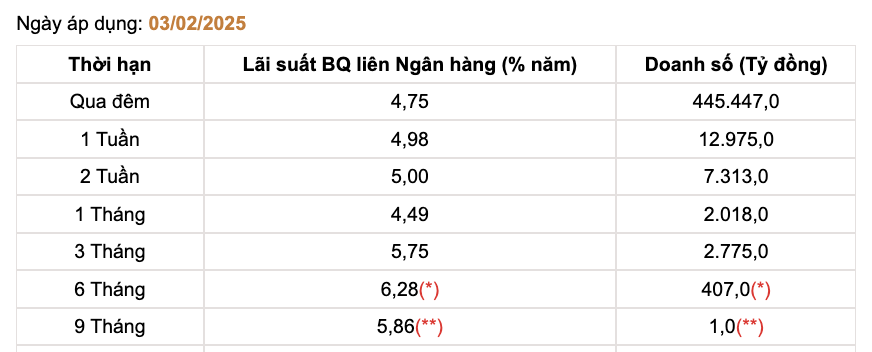 Lãi suất các kỳ hạn 1 tuần, 2 tuần và 3 tháng lần lượt ở mức 4,98%, 5% và 5,75%, nhích tăng tương ứng 0,16 điểm %, 0,24 điểm %, 0,4 điểm % so với lãi suất tại ngày 24/1.