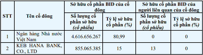Trong đó, NHNN sở hữu 4,62 tỷ cổ phiếu BID, tương ứng tỷ lệ 80,99% vốn điều lệ của ngân hàng. Còn cổ đông chiến lược Keb Hana Bank nắm 855,1 triệu cổ phiếu, tương ứng tỷ lệ sở hữu 15%. Người liên quan của cổ đông này nắm 13 cổ phiếu.