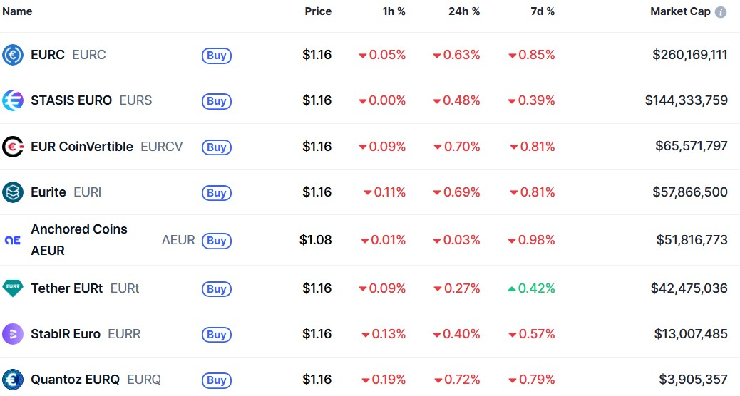 Vốn hóa thị trường stablecoin neo theo euro ước tính khoảng 650 triệu USD, chưa loại trừ các đồng không được MiCA cấp phép (Nguồn: CoinMarketCap)