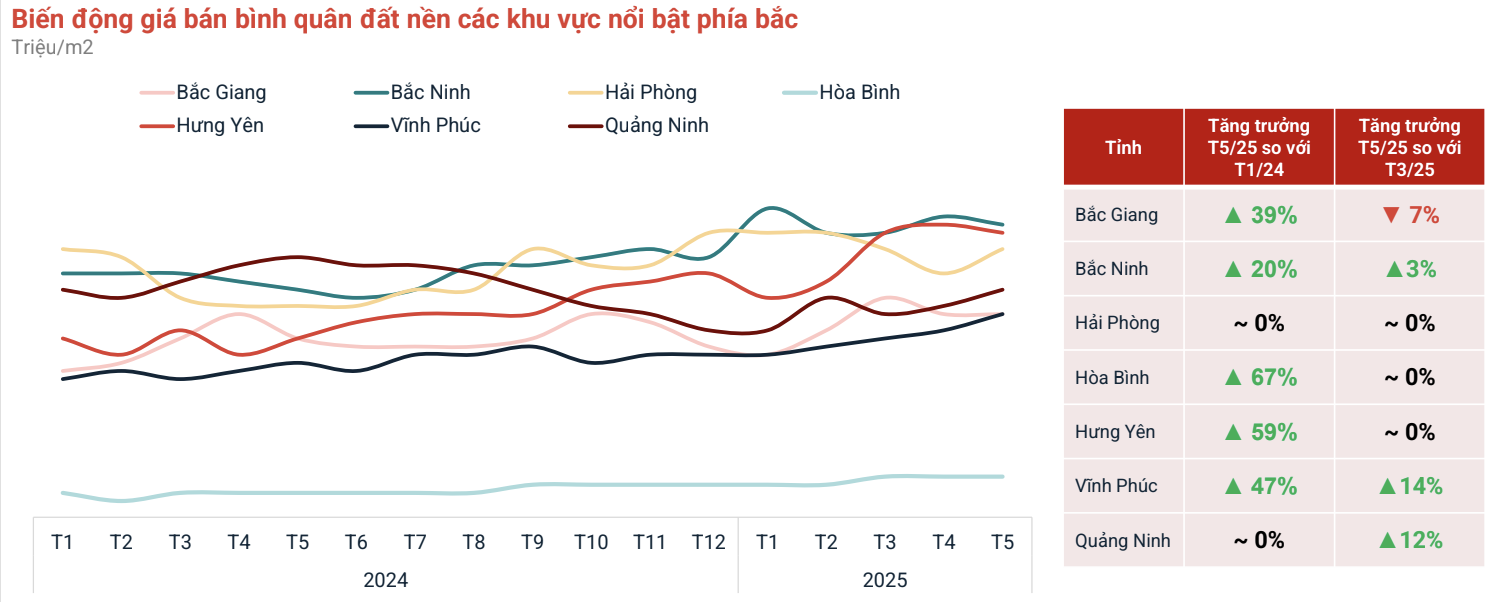 Theo báo cáo mới đây của Batdongsan.com.vn, mặt bằng giá bán đất nền tại các tỉnh phía Bắc vẫn giữ được sự ổn định so với đỉnh tháng 3/2025, thậm chí còn ghi nhận mức tăng trưởng khá cao nếu so với đầu năm 2024.