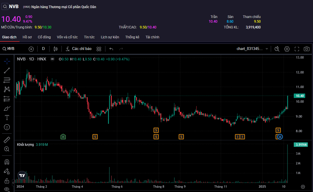 NVB tăng ngay khi mở cửa. Sau gần 2 tiếng giao dịch, mã cổ phiếu này tăng kịch biên độ lên 10.400 đồng/cp, với dư mua giá trần gần 1 triệu đơn vị. Thanh khoản của NVB cũng tăng vọt với khối lượng khớp lệnh đạt 3,9 triệu đơn vị - mức cao nhất trong hơn 2,5 năm.