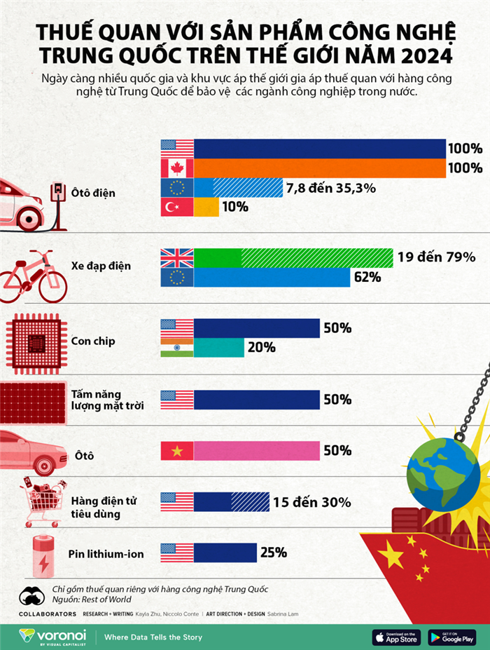 Đồ thị thông tin dưới đây gồm biện pháp thuế qua mà các quốc gia và khu vực đang áp đặt riêng với sản phẩm công nghệ cụ thể nhập khẩu từ Trung Quốc với dữ liệu tính tới tháng 11/2024.