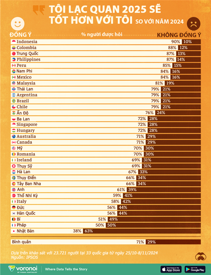 Đồ thị thông tin sau đây gồm các quốc gia lạc quan nhất về nền kinh tế năm 2025 so với năm 2024. Xếp hạng dựa trên Khảo sát dự báo thường niên năm 2025 của IPSOS với 23.721 người trưởng thành tại 33 quốc gia về kỳ vọng và dự đoán của họ về nền kinh tế toàn cầu trong năm mới.
